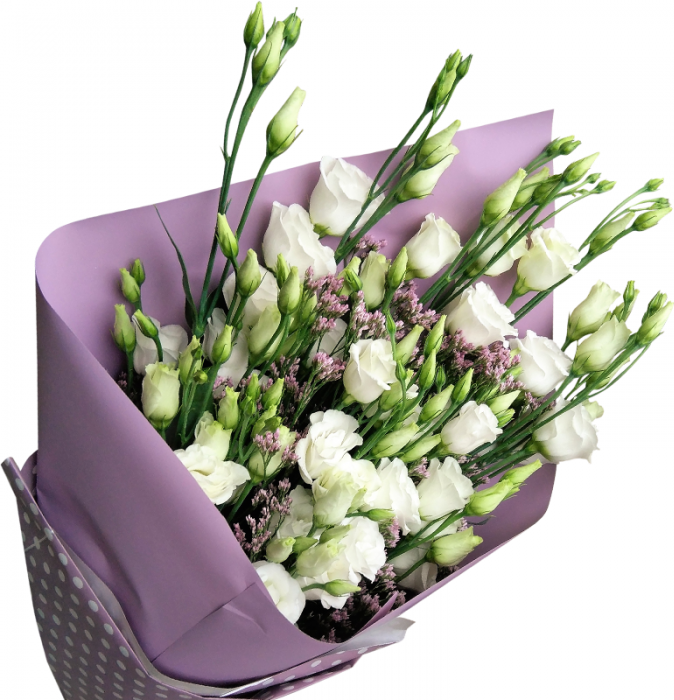 Интересный и эффектный букет из нежнейшего белого лизиантуса - цветка так похожего на розу, но не имеющего шипов, родиной которого считается Центральная Америка, станет прекрасным подарком для женщин, которые любят изысканные тропические цветы. Это удивительно красивые и нежные цветы, символизируют  чистоту чувств, нежность, романтичность и истинную любовь.